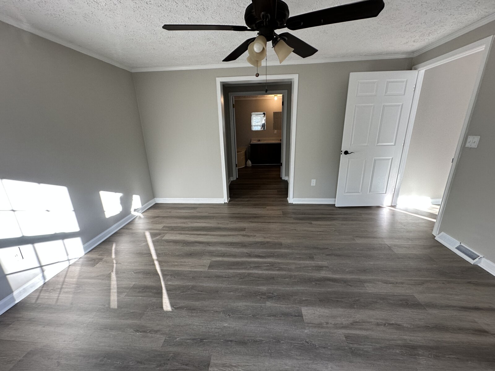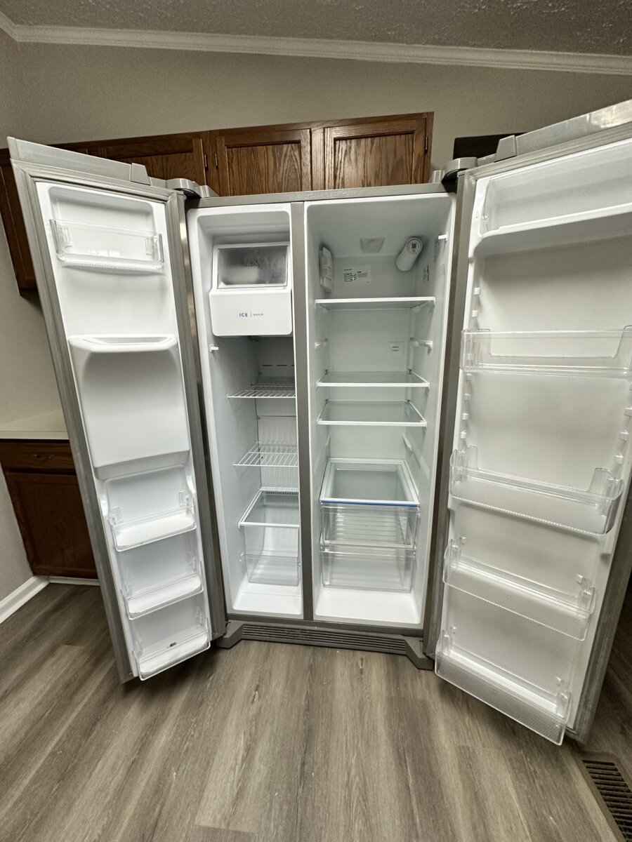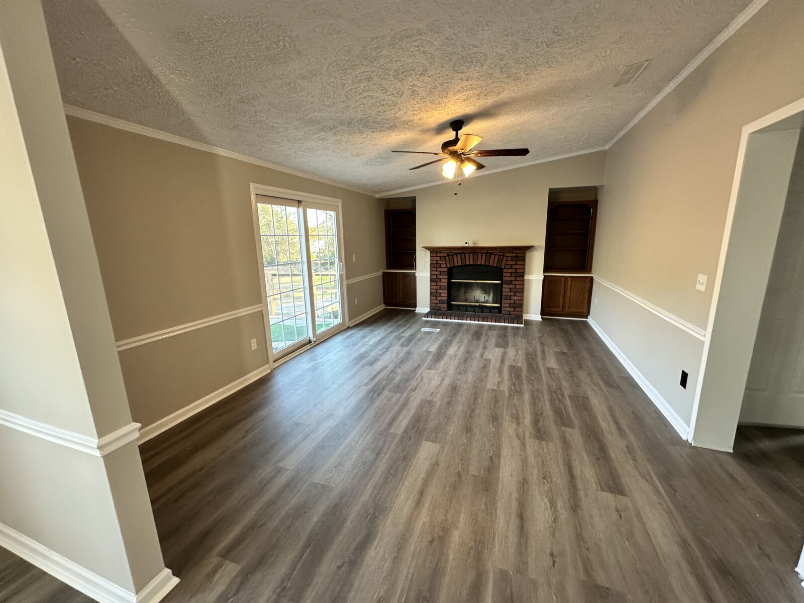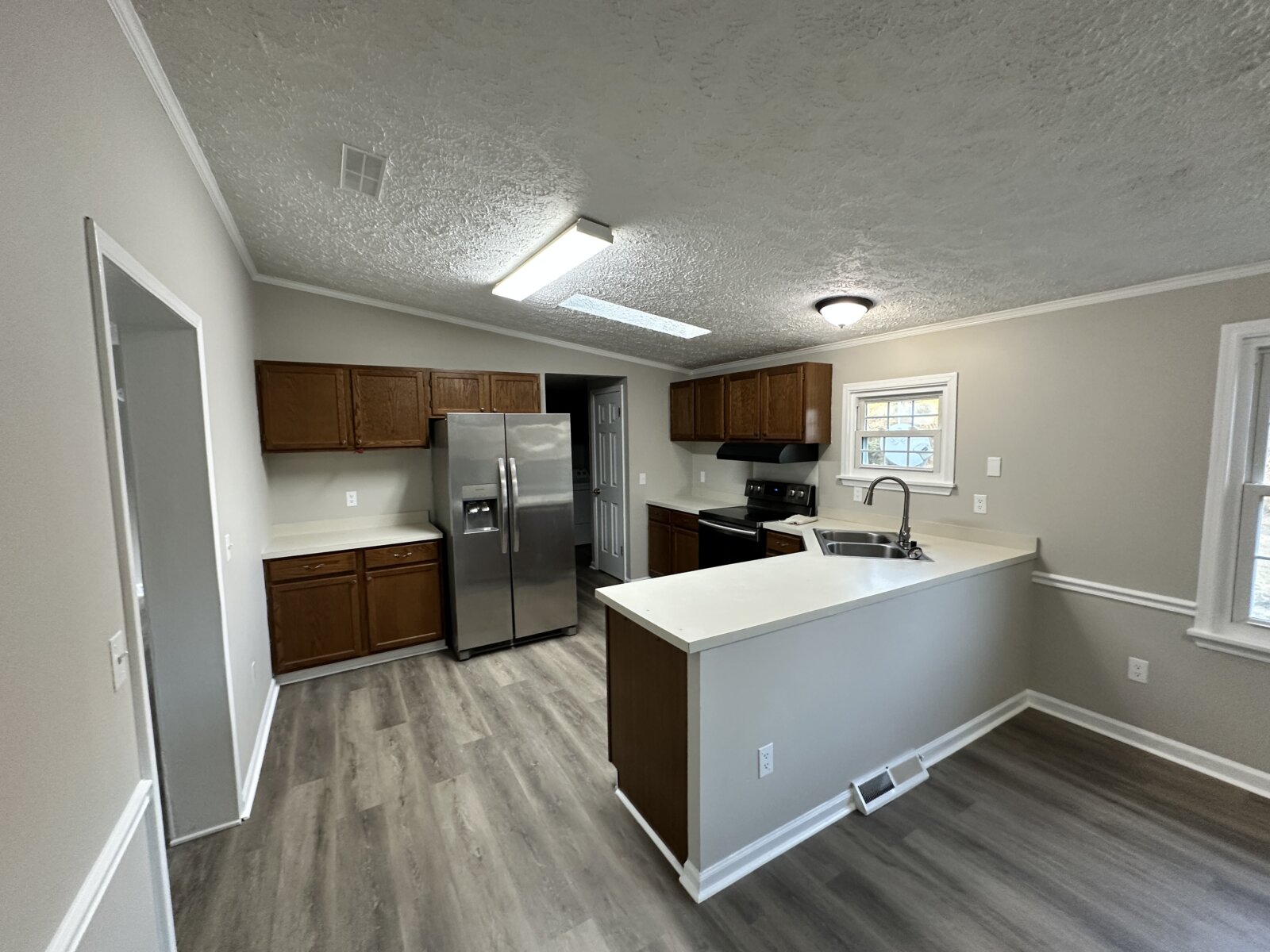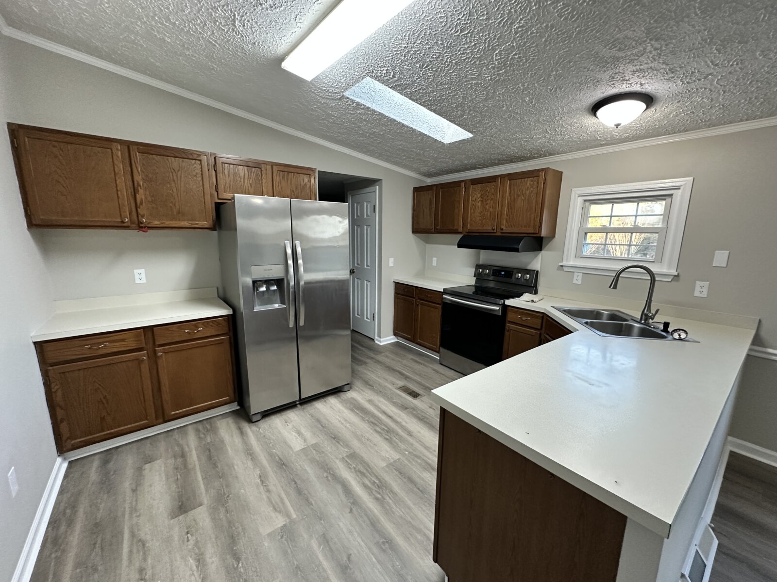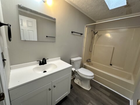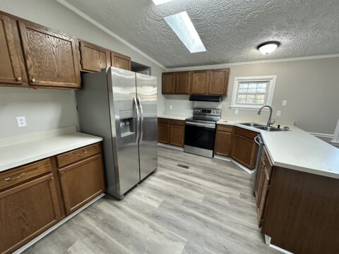 The home features a functional open layout with updated luxury vinyl plank flooring, fresh neutral paint, vaulted ceilings, skylights, and excellent natural light. The kitchen is clean and well maintained with stainless steel appliances, while the primary suite includes his-and-hers closets, a garden tub, and additional built-in storage. A wood-burning fireplace adds warmth and character to the main living space.